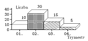 \begin{picture}(80,80)(0,0) \begin{barenv} \setdepth{10} \setstretch{1.4} \setnumberpos{up} \setxvaluetyp{month} \setxname{Trymestr} \setxaxis{10}{40}{10} \setyaxis{0}{40}{10} \setyname{Liczba} \bar{10}{1} \bar{30}{4} \bar{15}{6} \bar{5}{7} \end{barenv} \end{picture}